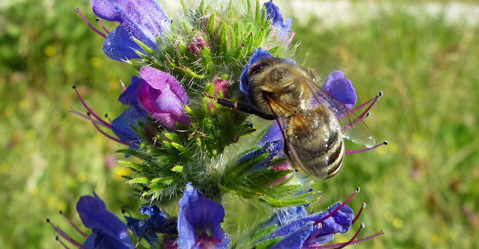 KAPAGs 2500 m2 grosse Blumenwiese weist viele, selten gewordene einheimische Pflanzen auf. Darunter befindet sich z.B. der Natternkopf (Hoplitis Adunca), von der sich die Natternkopf-Mauerbiene ausschliesslich ernährt. Der Bestand der Mauerbiene hängt also vollkommen von dieser Pflanzenart ab.