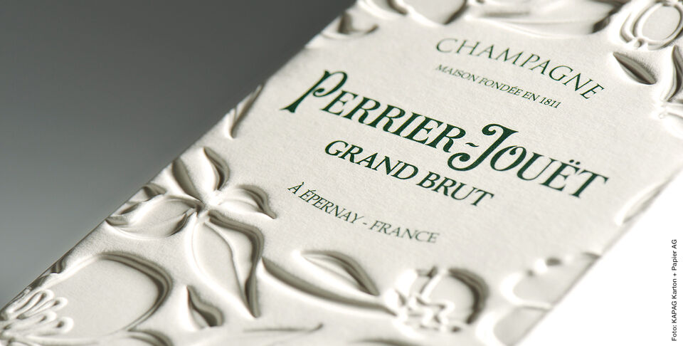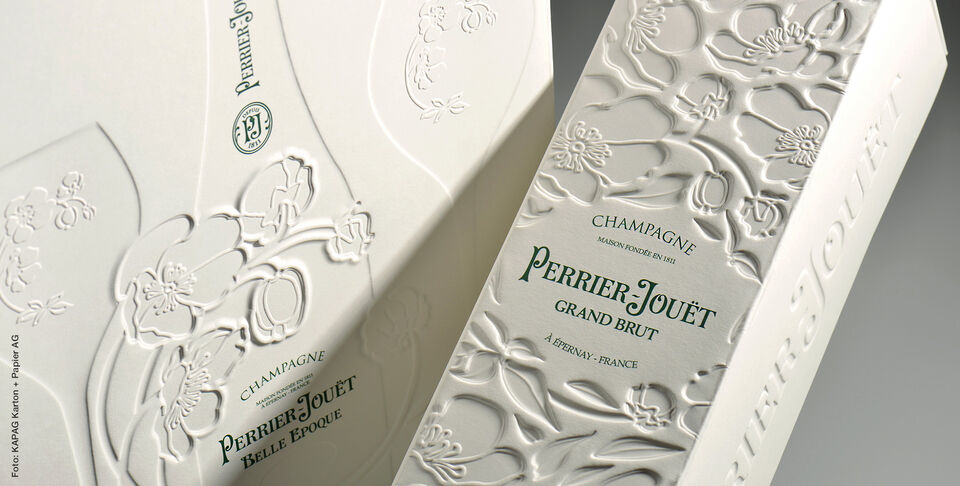 Die äusserst beeindruckende Tiefprägung des von der Art Nouveau inspirierten Blumenmusters benötigt kein Glanz und Gloria. Einzig der Markenname ist mit wasserbasierender Druckfarbe veredelt. Die Kartonoberfläche der Geschenkverpackung verfügt zudem über eine wunderbare Haptik, die zum Anfassen verführt und eine Hommage an den kreidehaltigen Boden der Champagne darstellt.